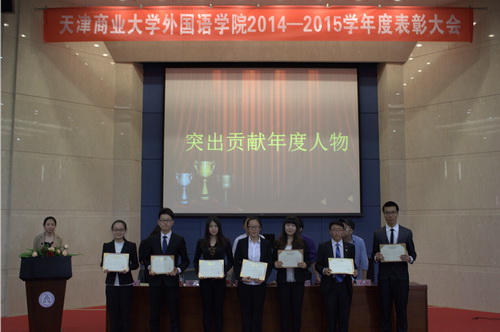 关于 2014-2015 学年度先进集体、优秀学生的表彰决定》。院系领导为获奖学生颁发证书并合影留念。本次大会共计颁发包括国家奖学金、天津市人民政府奖学金在内的各级各类荣誉 21 项,表彰优秀集体及个人687 人次。