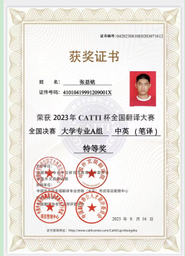 我院研究生在各类专业竞赛中成绩斐然,2023年荣获CATTI杯全国翻译大赛全国决赛特等奖、2024年荣获全国大学生外语翻译大赛省部级二等奖,2025年荣获第五届“用英语讲中国故事大会”省部级特等奖等。